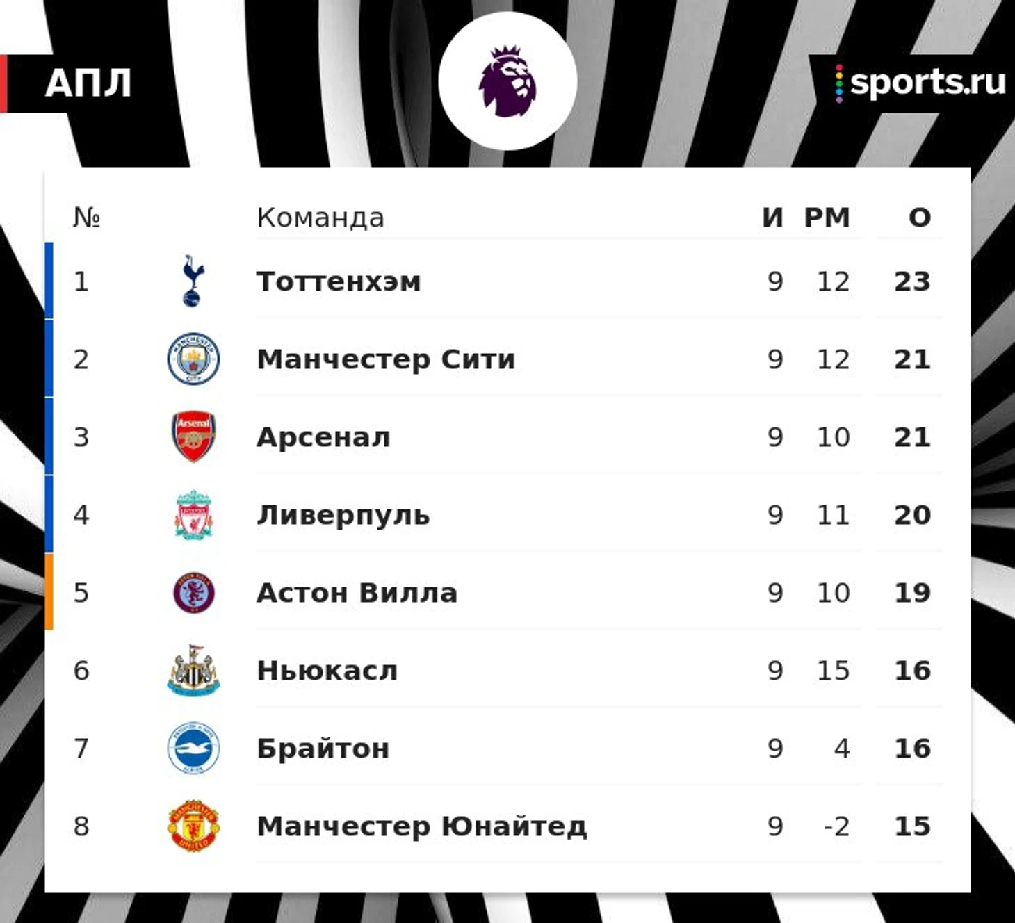 «Тоттенхэм» лидирует в АПЛ, опережая «Ман Сити» и «Арсенал» на 2 очка, «Ливерпуль» – на 3