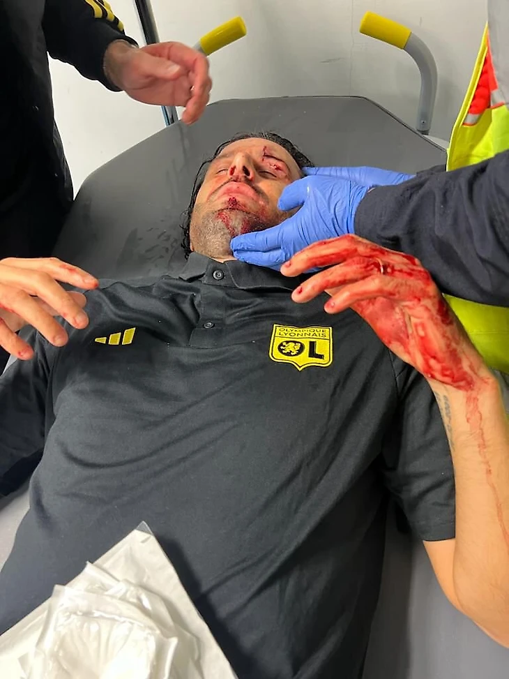 Осколки стекла попали в лицо главного тренера «Лиона» Фабио Гроссо. У итальянца случилось кровотечение, сообщает L’Équipe.