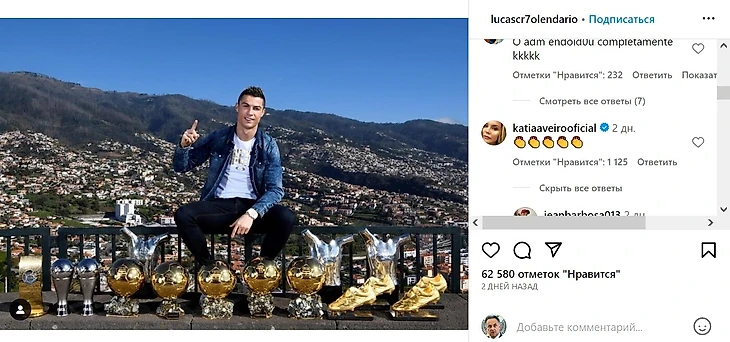 Катя Авейру, сестра Роналду, поставила под ним несколько аплодирующих эмодзи.