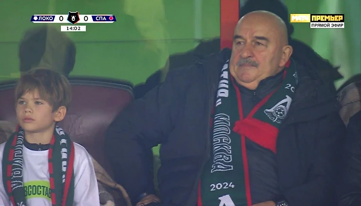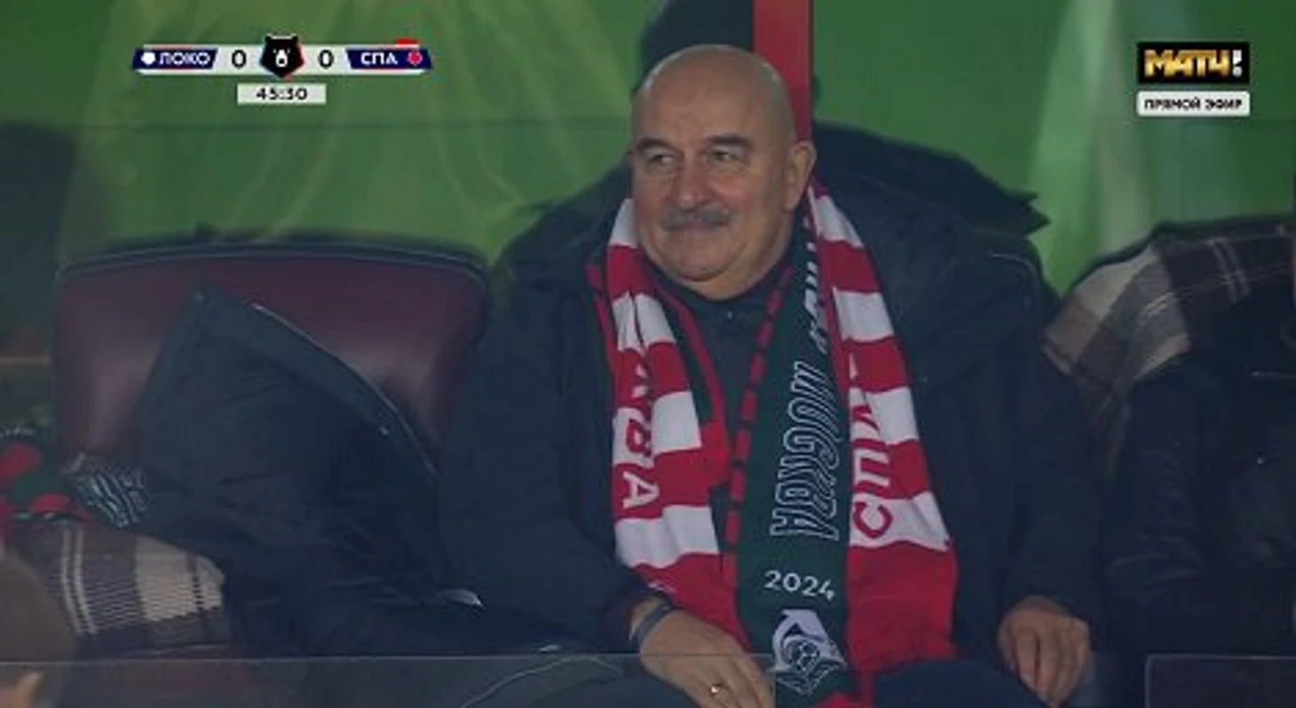 Черчесов в шарфе «Локо» смотрел первый тайм матча со «Спартаком» на «РЖД Арене». Шарф красно-белых появился у него позже