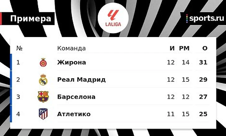 «Жирона» – лидер Ла Лиги после 12 туров, «Реал» отстает на 2 очка, «Барса» – на 4, «Атлетико» – на 6 при игре в запасе