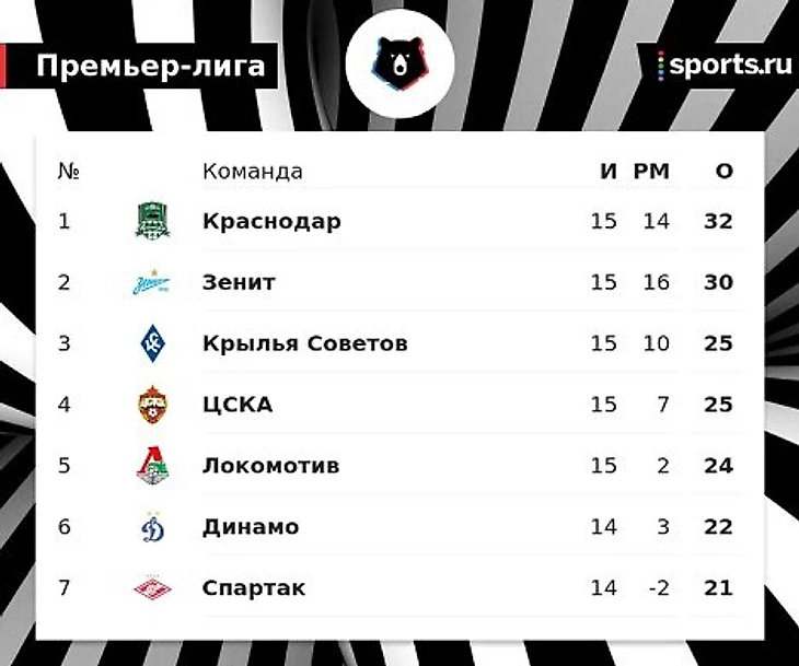 «Зенит» с 30 очками идет вторым, за ним следуют «Крылья Советов» и ЦСКА с 25 (догнать их может «Динамо» – 22 очка после 14 игр). «Спартак» идет 7-м с 21 очком после 14 матчей.