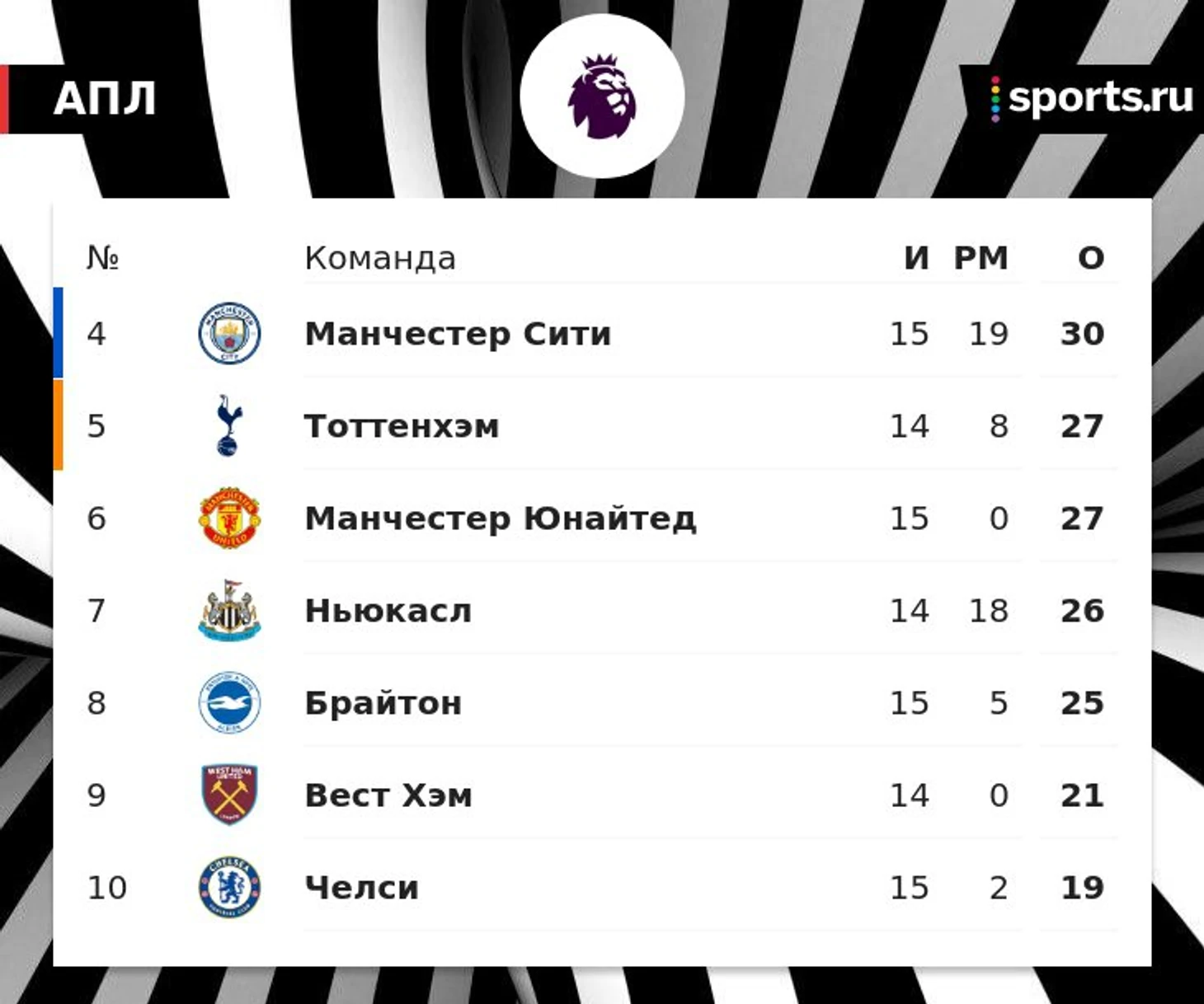 «МЮ», напротив, приблизился к топ-4 и отстает теперь лишь на 3 очка, занимая шестое место.