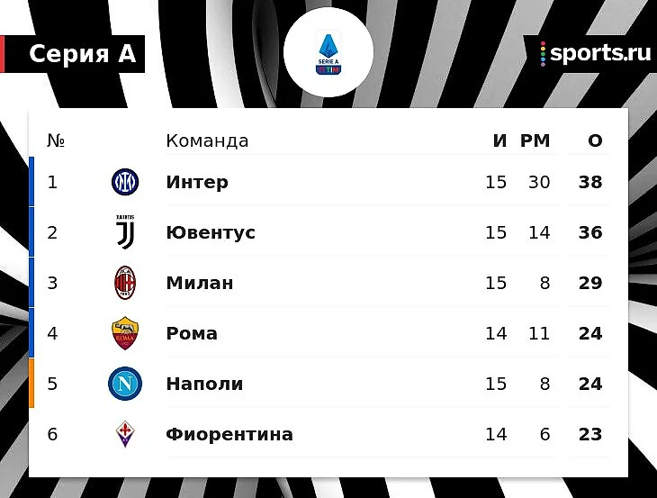 «Интер», разгромив «Удинезе» (4:0), сохранил первую строчку – у него 38 баллов. «Ювентус», в пятницу одолевший «Наполи» (1:0), отстает от «нерадзурри» на два очка.