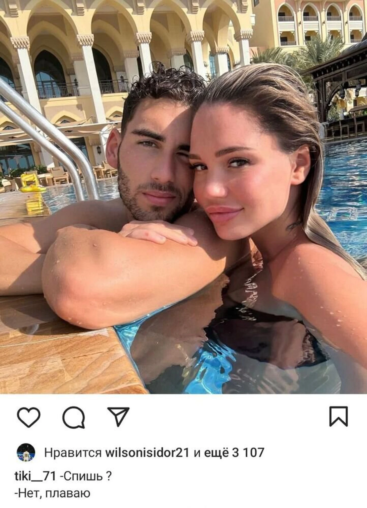 «Спишь? Нет, плаваю», – написал Тикнизян, прикрепив фото с женой в бассейне.