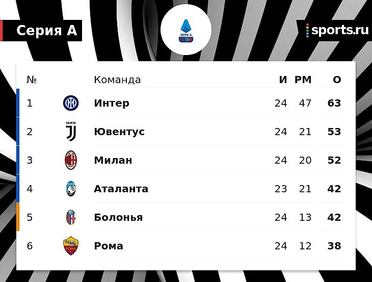 «Интер» лидирует в Серии А с 63 очками после 24 игр. У «Ювентуса» 53 балла, у «Милана» – 52.