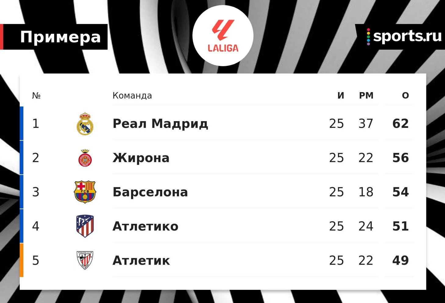 Также в топ-4 входит «Атлетико» с отставанием от лидера в 11 очков.