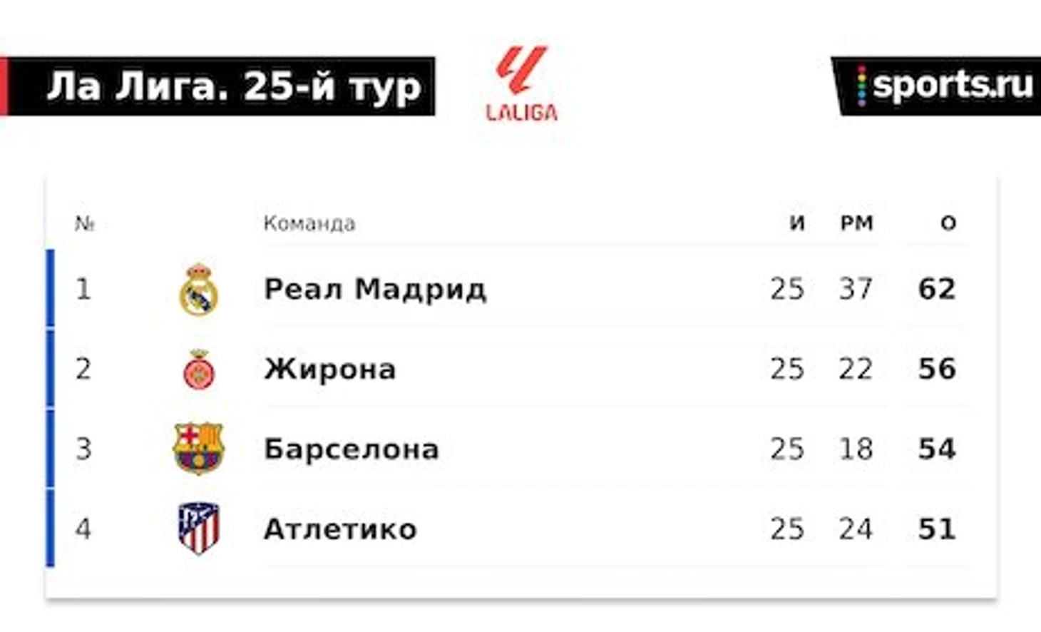 В прошлом туре «Реал» сыграл вничью с «Райо Вальекано» (1:1), «Жирона» проиграла «Атлетику» (2:3), а «Барселона» выиграла у «Сельты» (2:1).