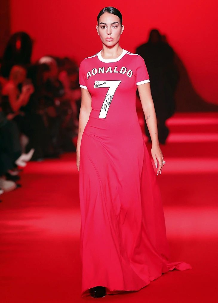 Джорджина Родригес представила бренд Vetements. Она вышла на подиум в красном платье, сшитом из футболки португальского футболиста, подписанной им самим.