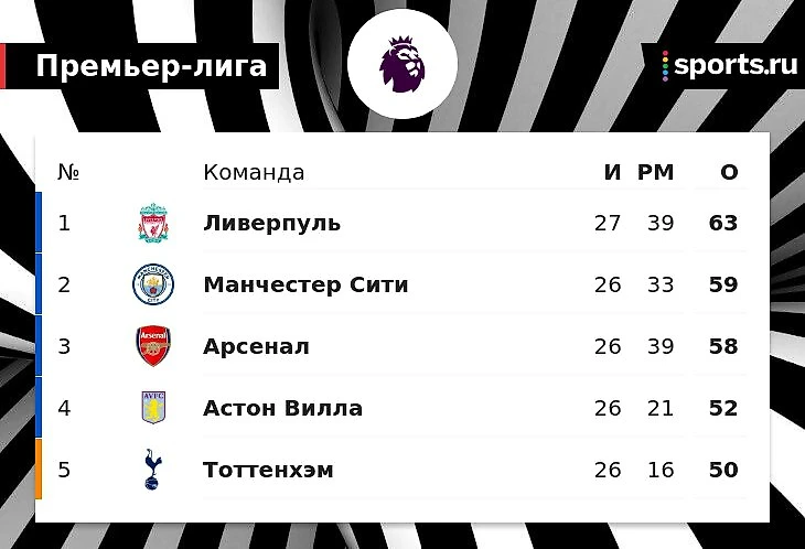 «Ливерпуль» в данный момент лидирует в турнирной таблице АПЛ, набрав 63 очка. «Манчестер Сити», идущий на 2-м месте, отстает на 4 очка перед завтрашним матчем с «Манчестер Юнайтед».
