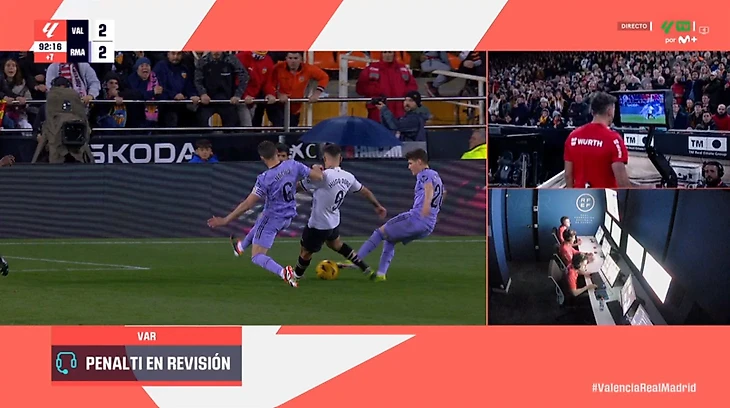 Судья отменил пенальти в ворота «Реала» на 90-й минуте после ВАР. Дуро упал, пытаясь пробить в борьбе с Начо и Франом