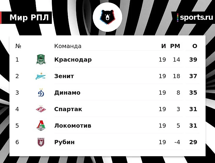На четвертом месте в таблице идет «Спартак». У него 31 очко – как и у «Локомотива».