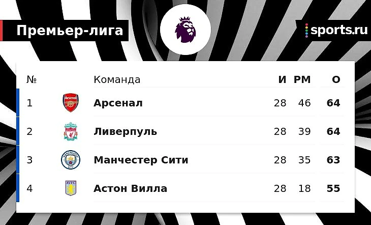 У «горожан» 63 балла, они идут третьими. Замыкает топ-4 «Астон Вилла» с 55 очками.