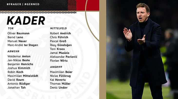 Тренер сборной Германии Юлиан Нагельсманн объявил состав из 26 игроков на товарищеские игры против Франции и Нидерландов.