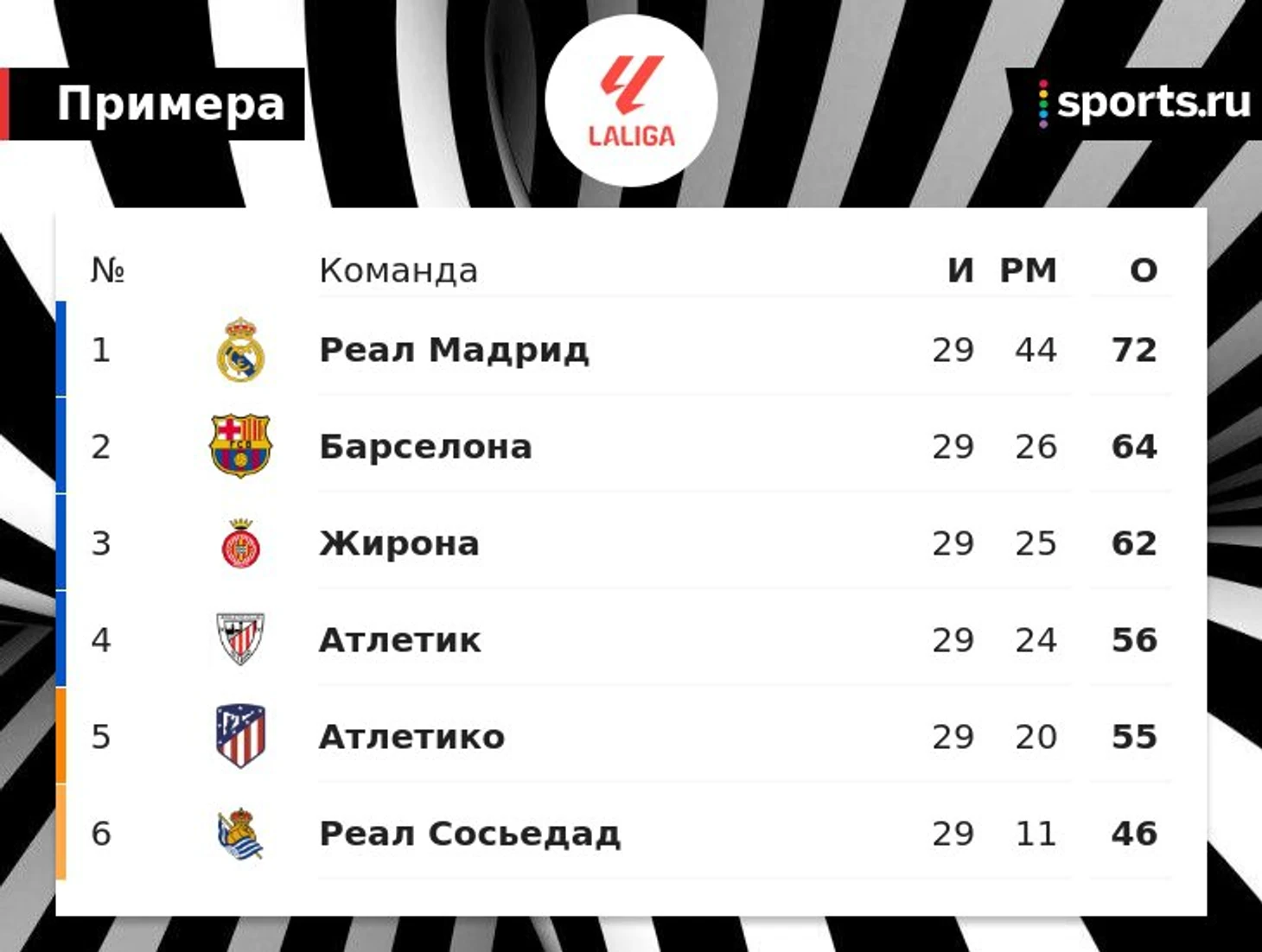 «Барселона» поднялась на 2-е место в Ла Лиге, обойдя «Жирону», и отстает от «Реала» на 8 очков. «Атлетико» опустился на 5-е место