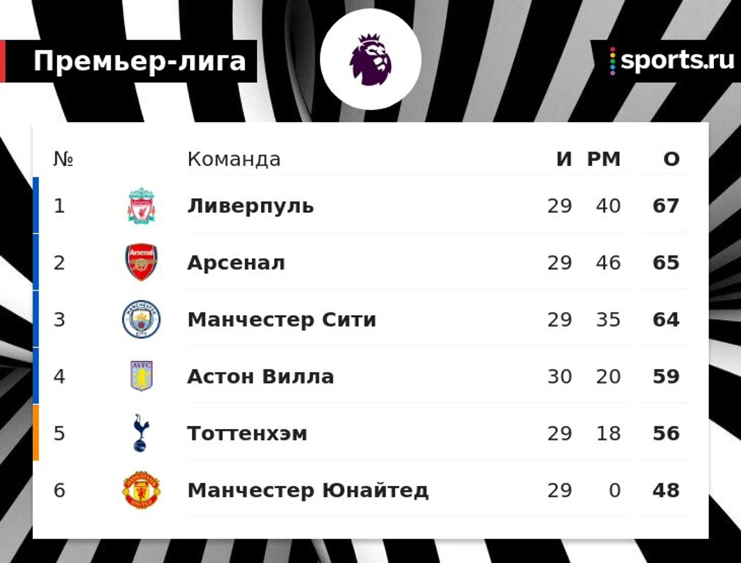Четвертой идет «Астон Вилла» (59 очков), пятым – «Тоттенхэм» (56), а «Манчестер Юнайтед» занимает 6-ю строчку, набрав 48 баллов.