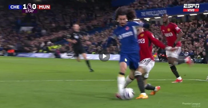 На 18-й минуте защитник лондонцев Марк Кукурелья принял мяч в штрафной площади соперника после паса Михаила Мудрика. Вингер «Юнайтед» Антони, догонявший испанца, выставил колено и сбил Кукурелью с ног.