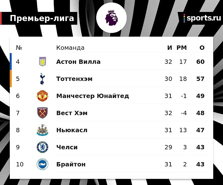 Отметим, что «Юнайтед» сыграл на 1 матч меньше «Астон Виллы», занимающей эту строчку.
