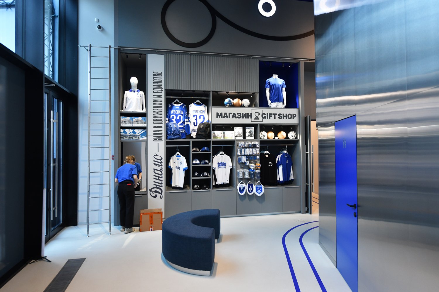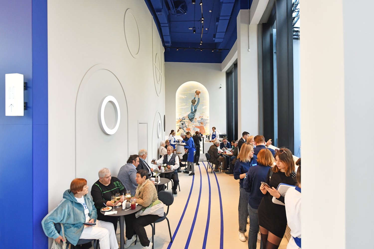 На первом этаже находится кафе с панорамным видом на парк, украшенное большим керамическом панно с изображением Льва Яшина, в меню которого можно найти любимые с детства советские блюда в современной интерпретации. В том числе, здесь расположен фан-шоп, коллекция которого постоянно обновляется атрибутикой и сувенирами от клубов «Динамо».