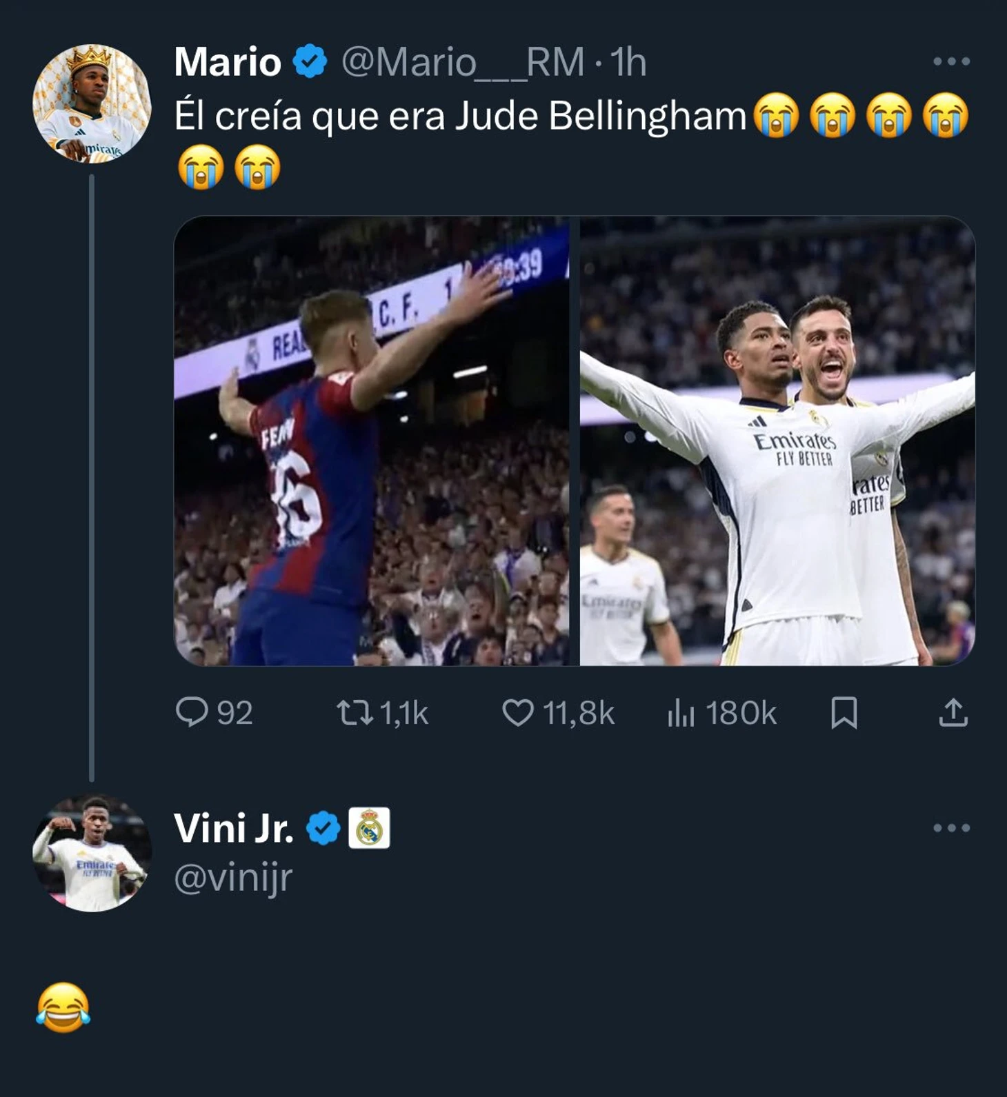Винисиус высмеял Фермина, отпраздновавшего в стиле Беллингема гол в класико. Вингер «Реала» оставил эмодзи 😂 под твитом болельщика