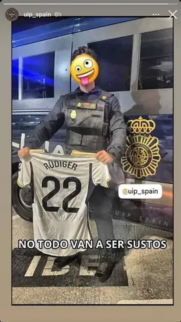 После матча Рюдигер подарил ему игровую футболку. Затем в социальных сетях подразделения полиции была опубликована фотография сотрудника с футболкой и подписью: «Не всех можно напугать».