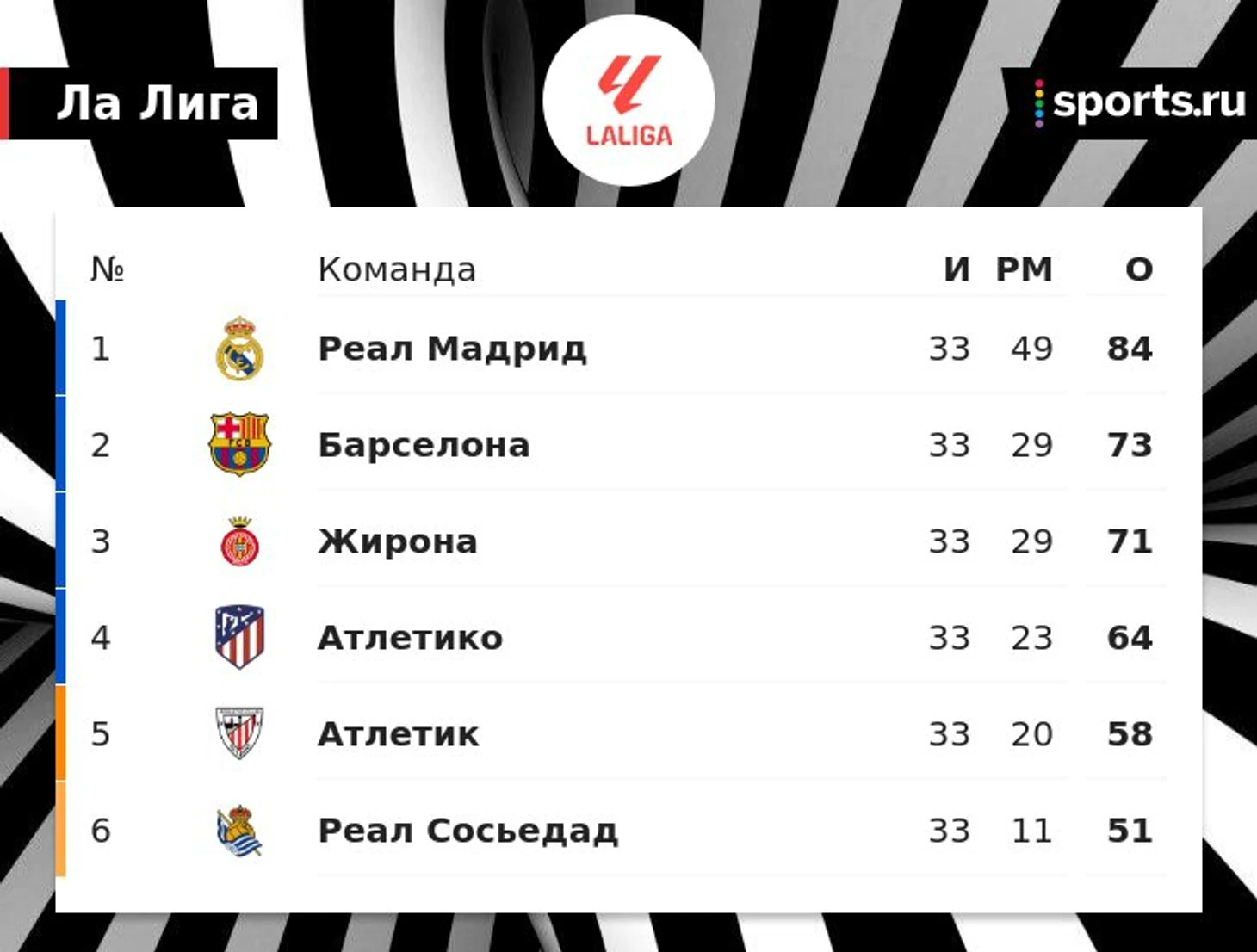 Также в топ-4 входят «Жирона» (71 очко) и «Атлетико» (64).