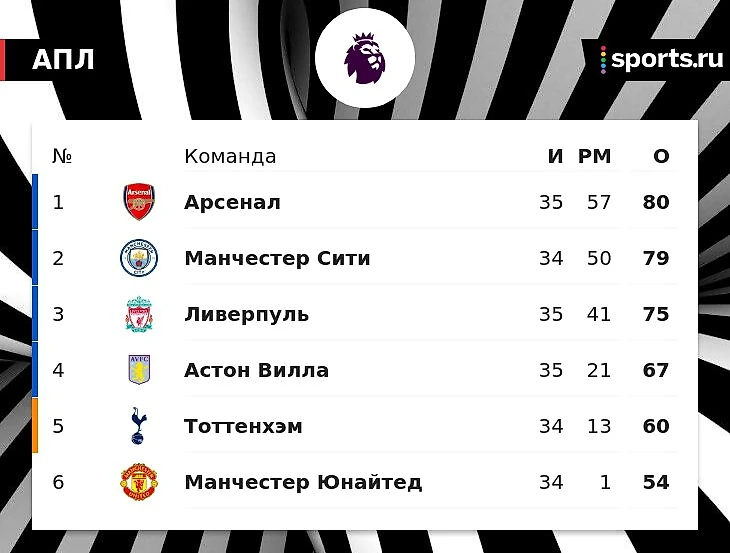 4-й идет «Астон Вилла» с 67 баллами в 35 матчах.