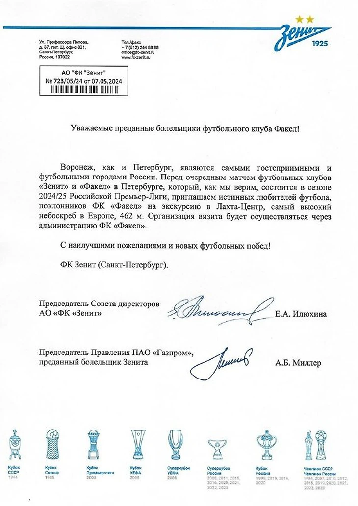 Организация визита будет осуществляться через администрацию ФК «Факел», – говорится в письме, подписанном председателем совета директоров «Зенита» Еленой Илюхиной и председателем правления ПАО «Газпром» Алексеем Миллером.
