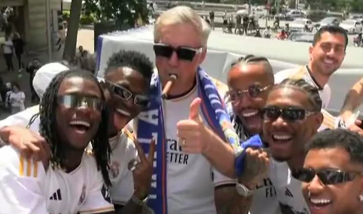 В Мадриде проходит чемпионский парад по поводу победы «Мадрида» в Ла Лиге: «Реал» ездит по городу на автобусе с открытым верхом. По ходу празднования Карло Анчелотти сфотографировался с футболистами команды в солнцезащитных очках и с сигарой.