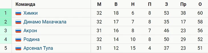 У «Акрона» 56 очков в 31 матче и третья строчка, у идущего вторым «Динамо» 58 баллов после 32 игр, у лидирующих «Химок» – 60.