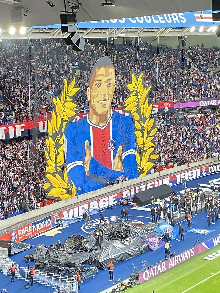 Перед началом матча ультрас парижан развернули баннер с изображением Мбаппе в футболке «ПСЖ» на фоне золотого лаврового венка.