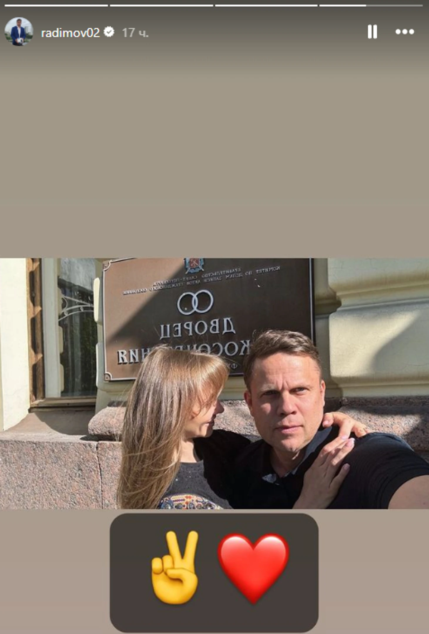Бывший футболист «Зенита» и сборной России выложил фото вместе с девушкой Анастасией Кулешовой у ЗАГСа. Также Радимов опубликовал фото уведомления на государственную регистрацию заключения их брака.
