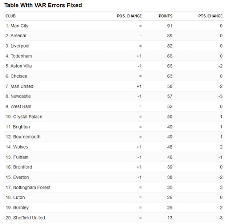 Если бы ошибок ВАР не было, «Ноттингем» получил бы на три очка больше. В то же время у «Астон Виллы» было бы меньше на 2 очка, и клуб опустился бы на 5-е место, «Тоттенхэм» был бы 4-м из-за корректировки разницы мячей и попал бы в Лигу чемпионов на следующий сезон.
