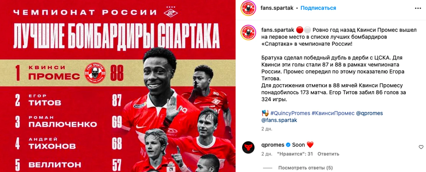 В фан-аккаунте красно-белых выложили пост, в котором напомнили, что год назад Квинси вышел на 1-е место в списке лучших бомбардиров клуба в чемпионате России.
