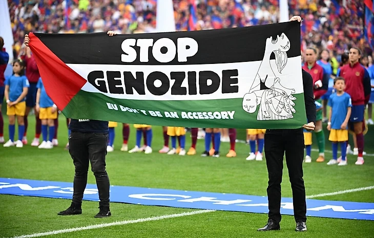 L’Equipe передает, что незадолго до начала игры между «Барселоной» и «Лионом» два человека, явно получившие аккредитацию, растянули флаг с надписями «Остановите геноцид» и «ЕС, не будь соучастником». Они это сделали после того, как футболистки вышли из подтрибунного помещения и выстроились на поле.