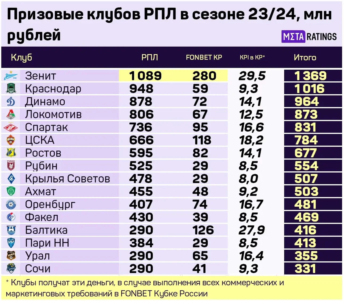Согласно подсчетам Metaratings, выиграв Мир РПЛ и Фонбет Кубок России, петербуржцы заработали 1,369 млрд рублей (1,089 млрд и 280 млн соответственно). Еще 29,5 млн они могут получить за выполнение всех коммерческих и маркетинговых требований в Кубке.