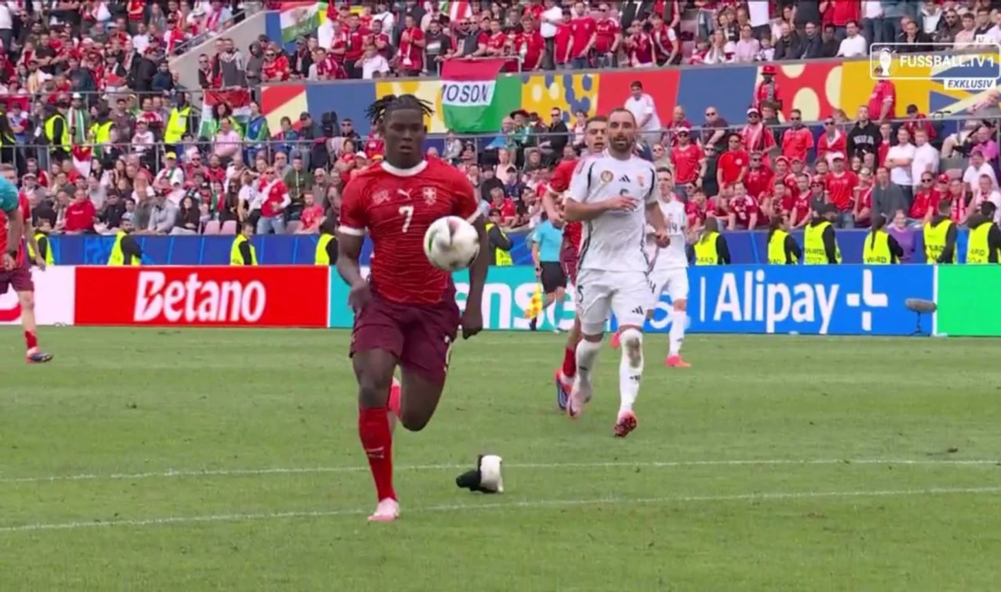 У Эмболо слетел бандаж с бедра перед голом в ворота Венгрии на 93-й. Форвард Швейцарии вышел 1 на 1 и перекинул вратаря