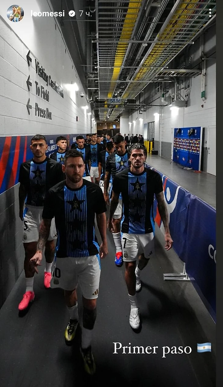 Нападающий аргентинцев Лионель Месси опубликовал сторис с фото команды и подписью: «Первый шаг 🇦🇷».