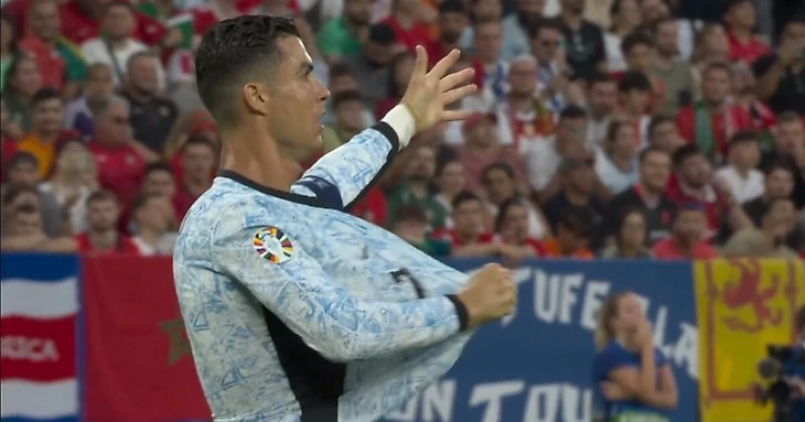 На 27-й минуте сборная Португалии разыграла угловой, и 39-летний форвард, пытаясь добраться до мяча, упал на газон. Защитник Лука Лочошвили придерживал его за футболку.