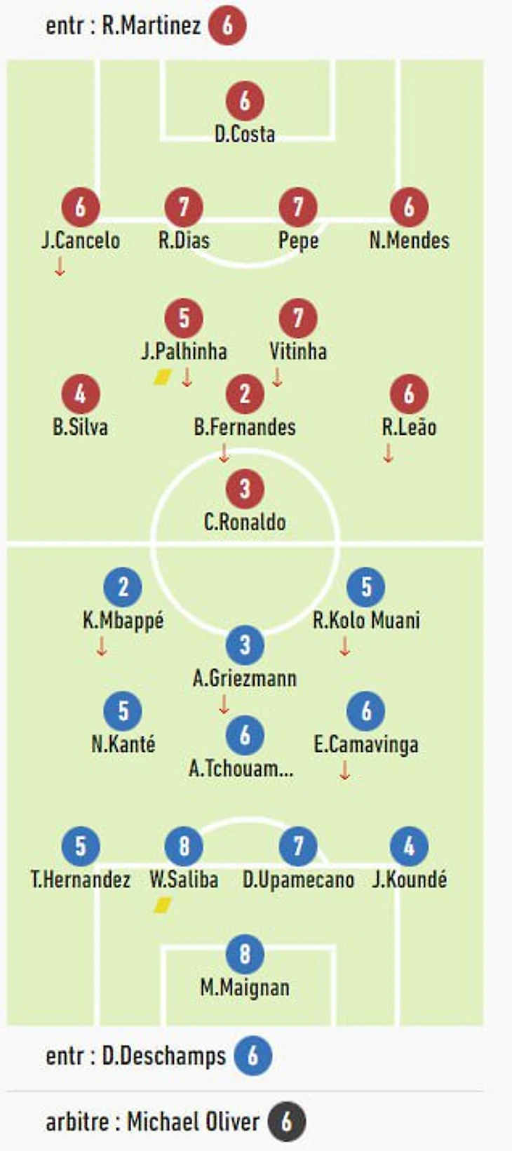 Худшими игроками матча по версии L’Équipe стали форвард «Реала» Килиан Мбаппе, а также португальский полузащитник «Манчестер Юнайтед» Бруну Фернандеш. Оба игрока получили по 2 балла из 10 возможных.
