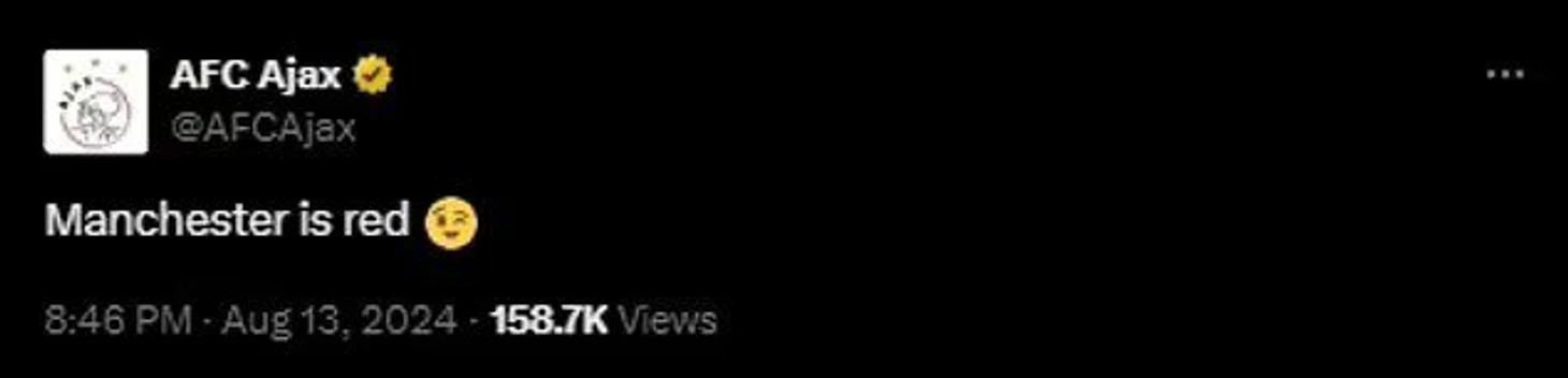 Нидерландский клуб пошутил по этому поводу в соцсетях. На своей странице в X (ранее Twitter) официальный аккаунт «Аякса» опубликовал сообщение «Манчестер красный», добавив подмигивающий смайлик.