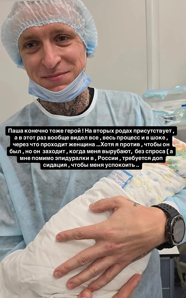 «Паша, конечно, тоже герой. На вторых родах присутствует, а в этот раз видел вообще все, весь процесс, и в шоке, через что проходит женщина... Хотя я против, чтобы он был. Но он заходит, когда меня «вырубают», без спроса», – написала Санько в инстаграме.