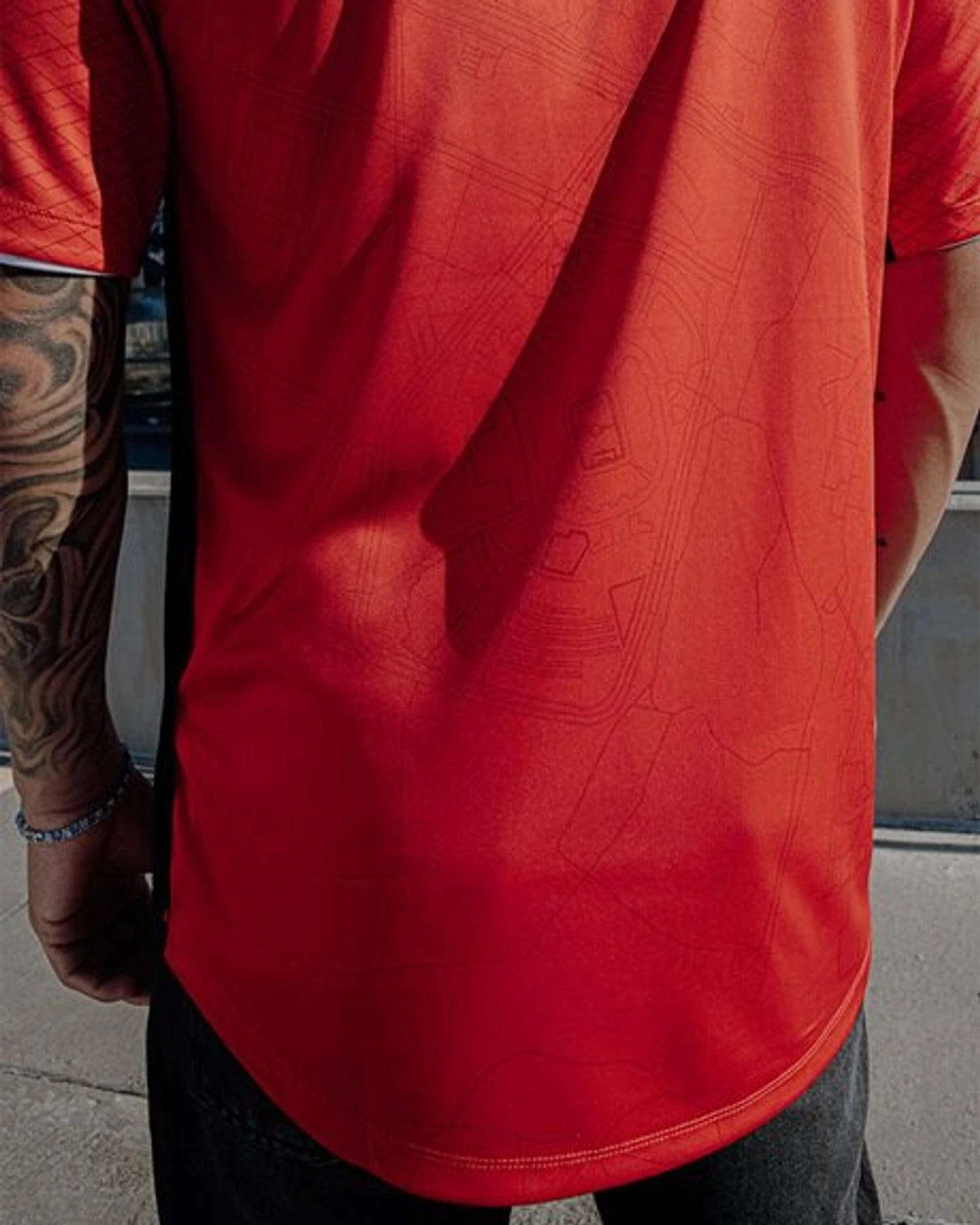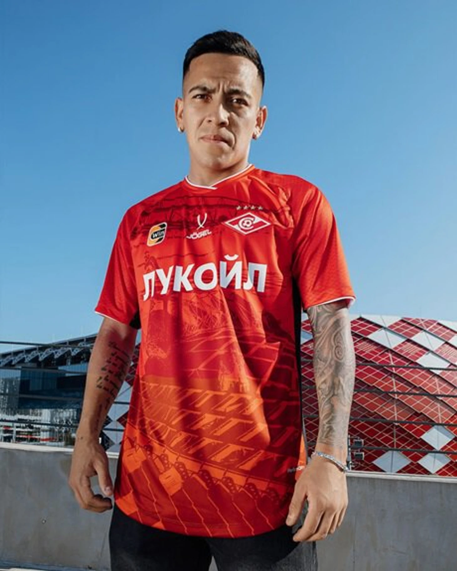 На майку красного цвета нанесен особенный принт: ромбы фасада «Лукойл Арены», гладиатор, памятник основателям клуба – великим братьям Старостиным. Помимо этого, на спине изображен фрагмент карты Москвы в районе стадиона.