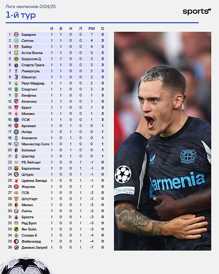 «Бавария» лидирует в ЛЧ после 1-го тура, «Юве» и «Реал» делят 8-е место, «ПСЖ» – 15-й, «Барса» – 23-я, «Милан» – 29-й из 36