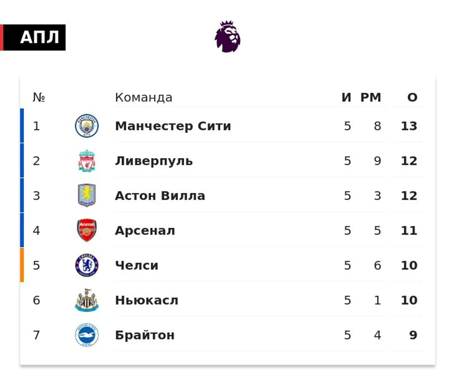 «Ман Сити» лидирует в АПЛ после 5 туров. «Ливерпуль» и «Вилла» отстают на 1 очко, «Арсенал» – на 2, «Челси» и «Ньюкасл» – на 3