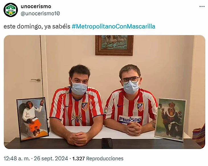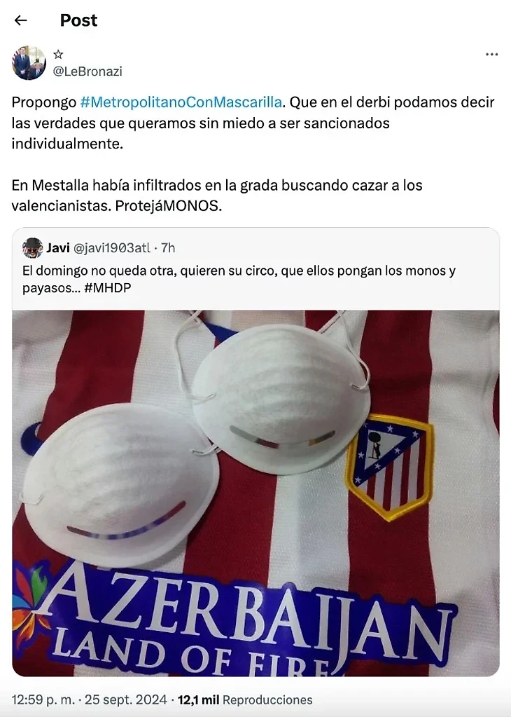В одном из постов с хэштегом #MetropolitanoConMascarilla размещена фотография двух мужчин в форме «Атлетико», сидящих за столом, рядом с ними есть снимки обезьян, у которых видны атрибуты «Реала».
