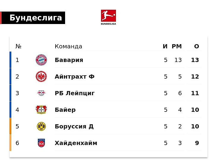Лидирует «Бавария» – у нее 13 баллов. «Лейпциг» занимает третью строчку (11 очков), следом идут «Байер» и «Боруссия» Дортмунд (по 10).