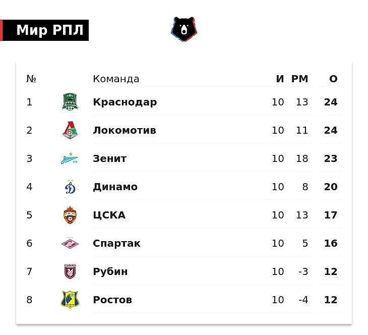 На сегодняшний день первое место с 24 очками занимает «Краснодар», «Локомотив» уступает ему только по дополнительным показателям. Петербуржцы с 23 очками идут третьими. «Динамо» четвертое – 20 очков.