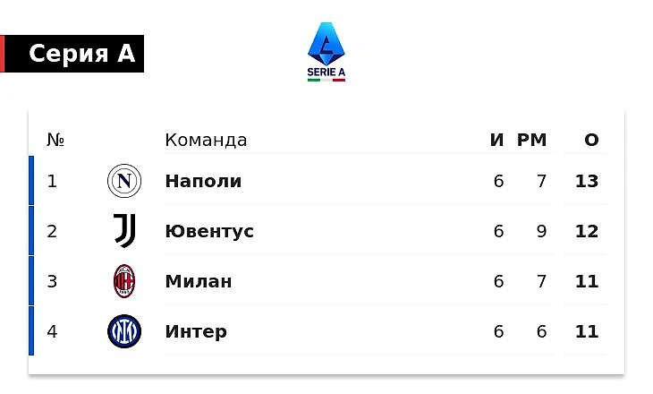 Команда Конте лидирует в таблице после 6 туров, набрав 13 баллов и на 1 очко опережая «Юве».