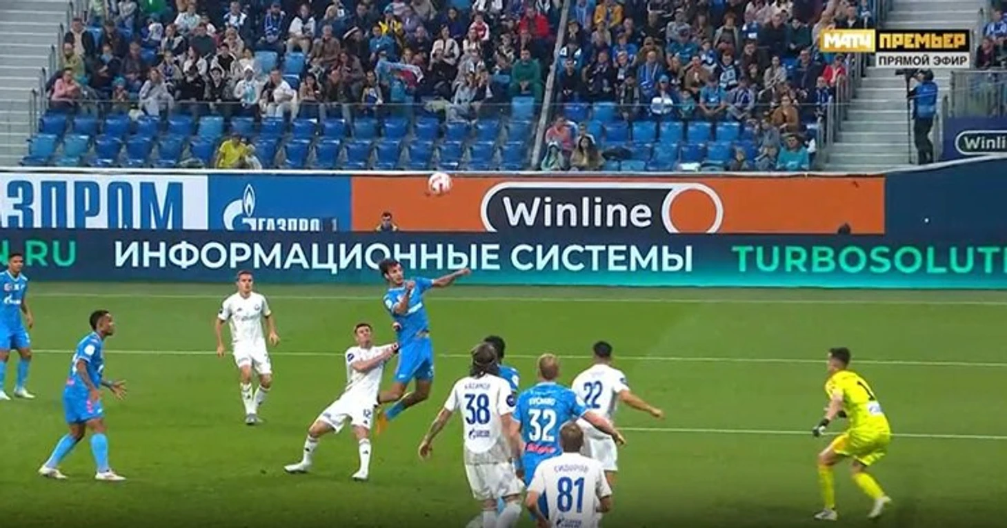 На 56-й минуте матча 11-го тура Мир РПЛ капитан гостей Андрей Малых в штрафной подтолкнул в спину хавбека петербуржцев Александра Ерохина.
